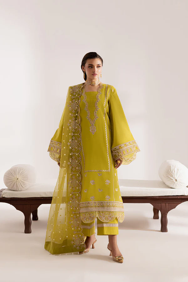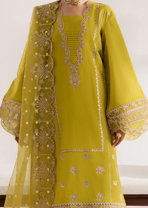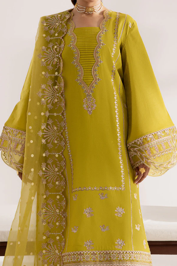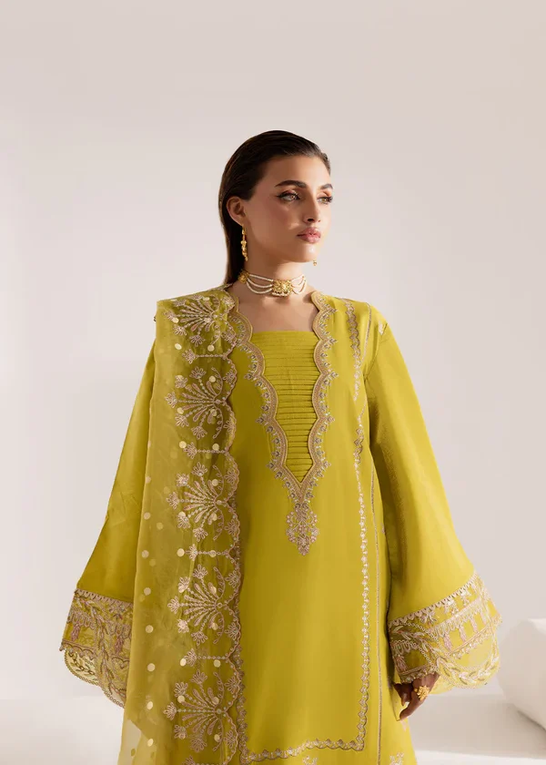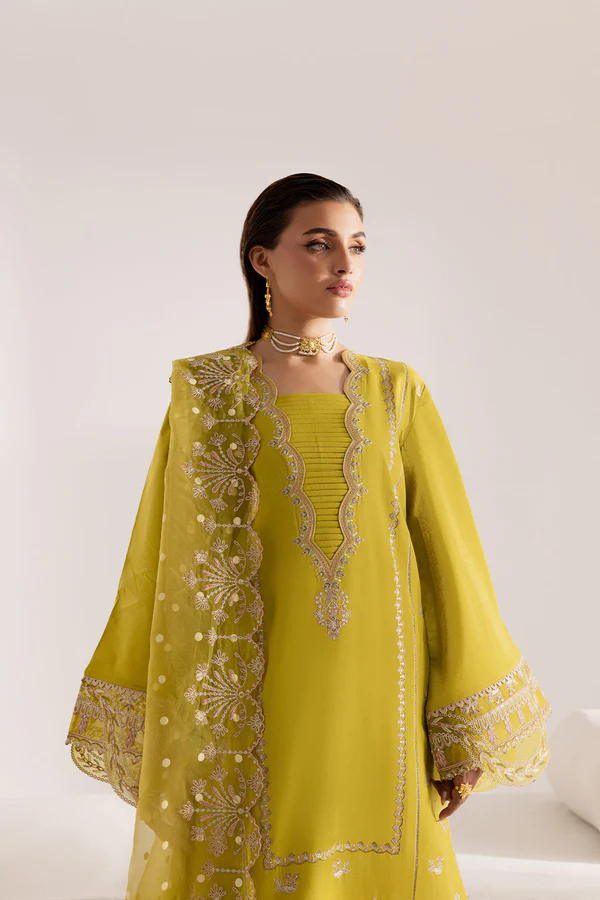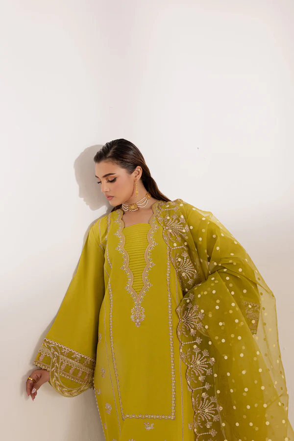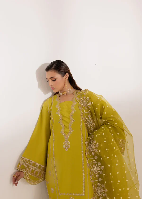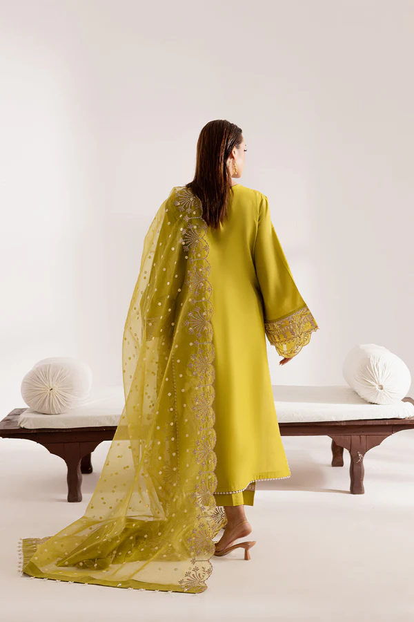 Sheen green embroidered cotton shirt and culottes with organza borders, paired with an embroidered and embossed print organza dupatta with hangings.