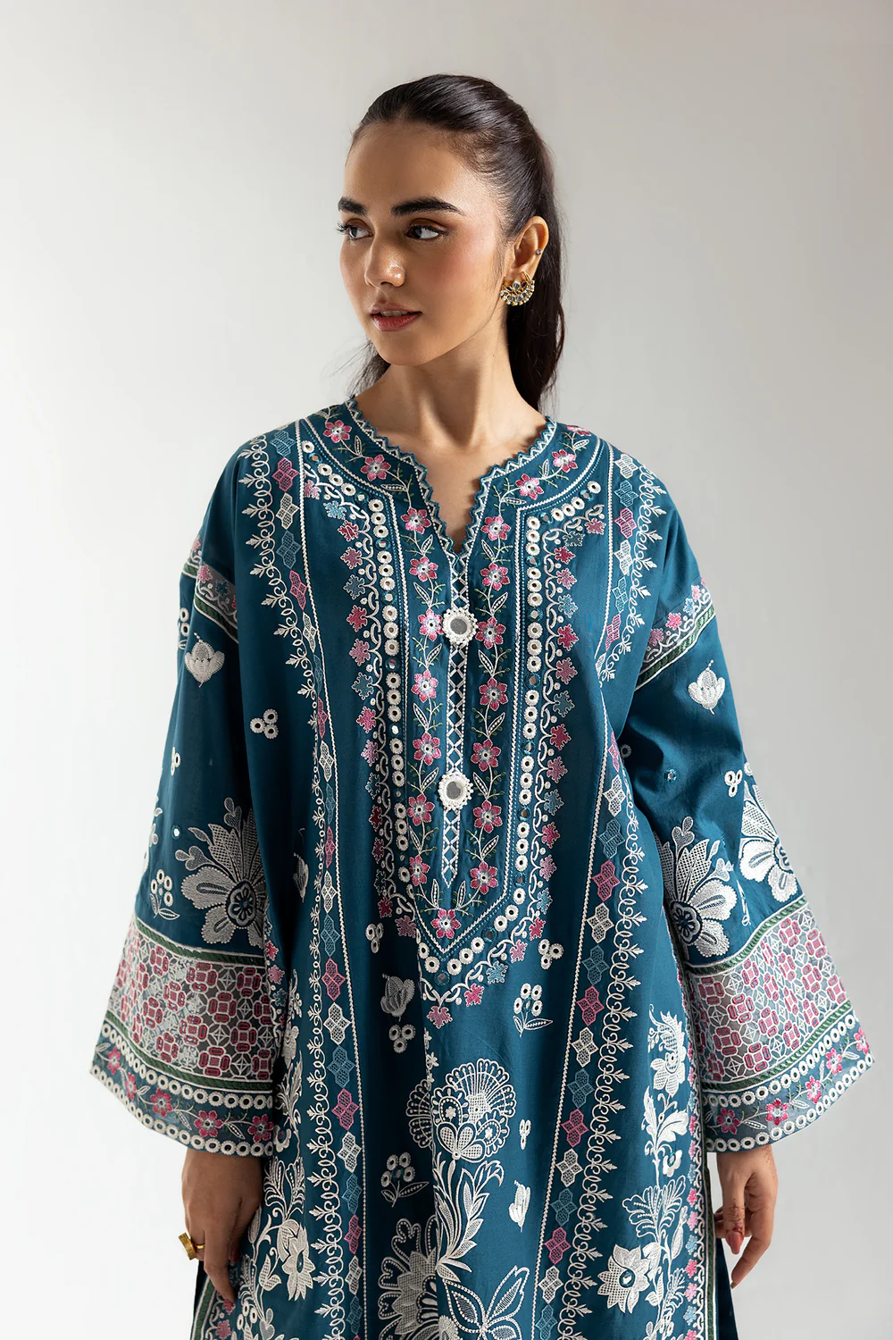 Wrap yourself in the rich teal hues of this outfit, where the deep color provides a stunning canvas for the intricate embroidery. Delicate white and subtle pink threads bloom across the kurta, highlighting its refined details. The straight-cut design features a classic round neckline with an exquisitely embroidered placket, complemented by full-length sleeves adorned with coordinating motifs. Completing the ensemble are the comfortable and stylish straight trousers in a matching teal shade, their subtle border detailing echoing the kurta’s embroidery for a cohesive and polished look. Perfect for adding a touch of refined tradition to your personal style.