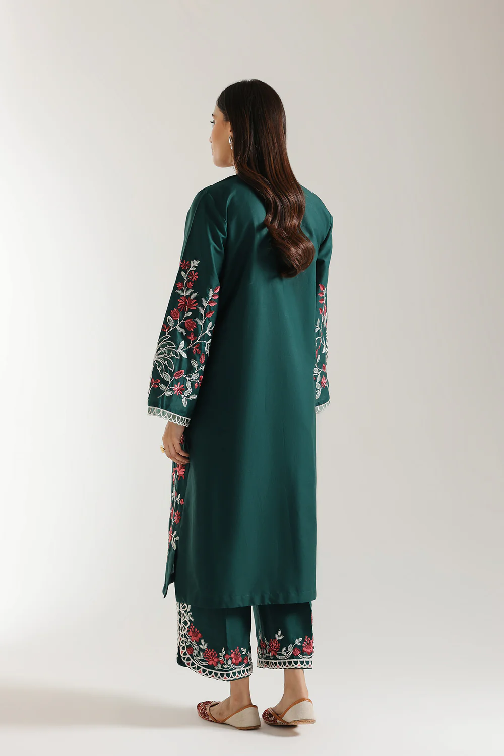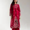Immerse yourself in the timeless beauty of Verdant Grace — a forest green ensemble that exudes refined elegance and cultural richness. Crafted in a deep, enchanting green, the shirt is brought to life with intricate white and red floral and paisley embroidery. The V-neckline features a decorative border, while delicately embroidered long sleeves lend a regal charm. The relaxed silhouette ensures effortless comfort, allowing for graceful movement with every step. Completing the look are matching forest green trousers, subtly embroidered along the hem for a harmonious and elevated finish.