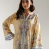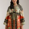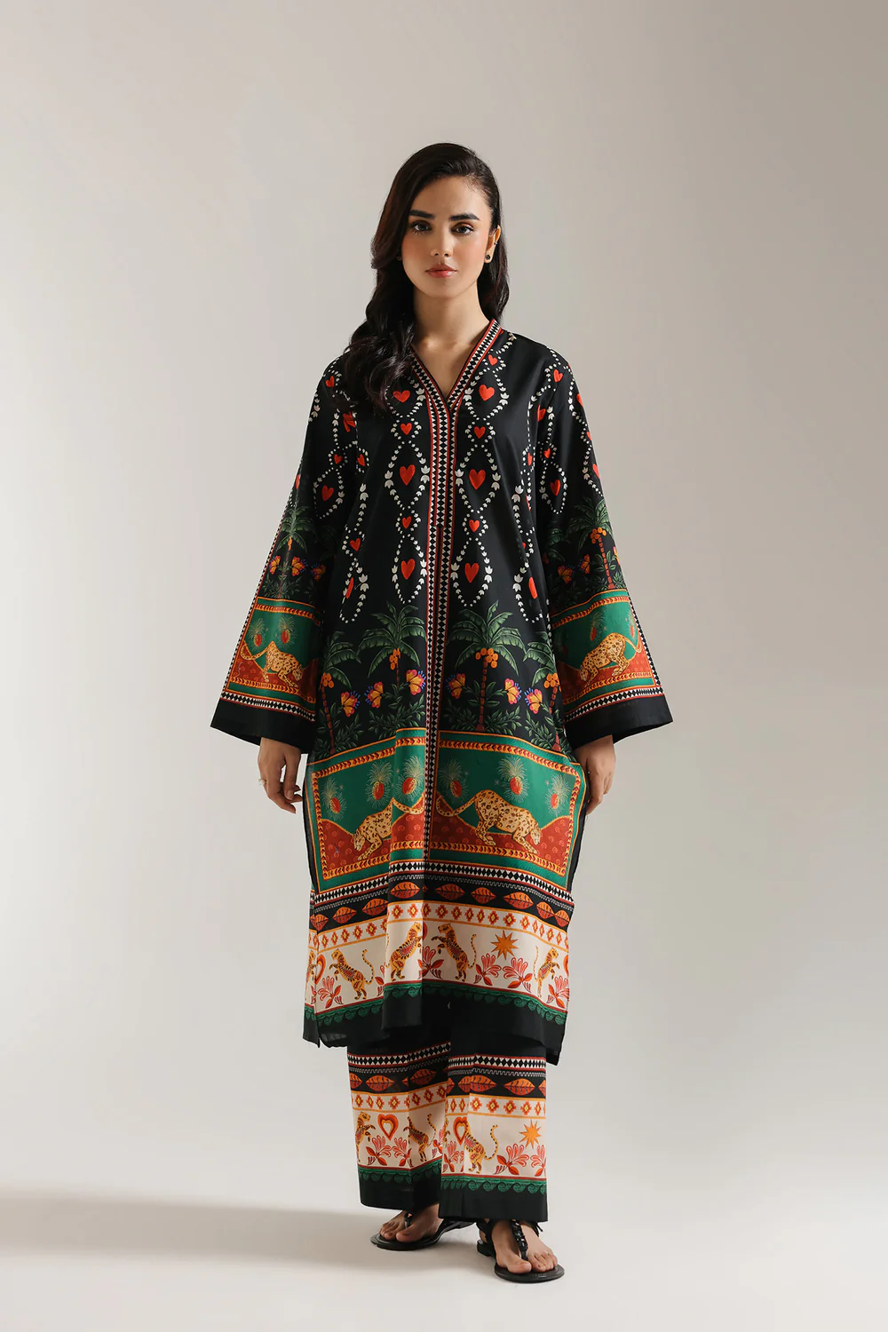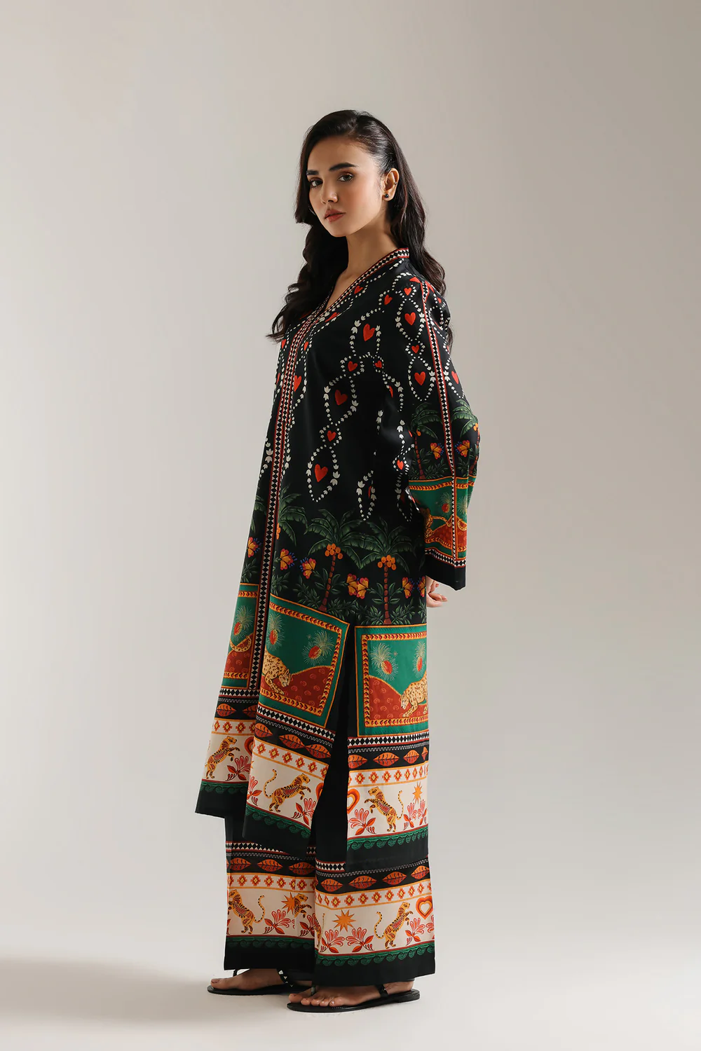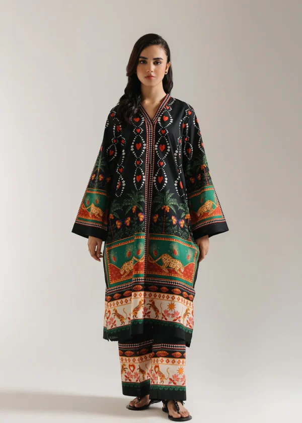 Make a bold statement with this striking two-piece set. The shirt features a rich, dark base adorned with a captivating and colorful print, inspired by nature and traditional motifs. Details such as contrasting borders on the sleeves and hem add visual interest. The relaxed silhouette and V-neckline ensure a comfortable fit. Paired with matching printed pants, this ensemble creates a cohesive and fashionable look. Perfect for those who appreciate unique patterns and vibrant style.