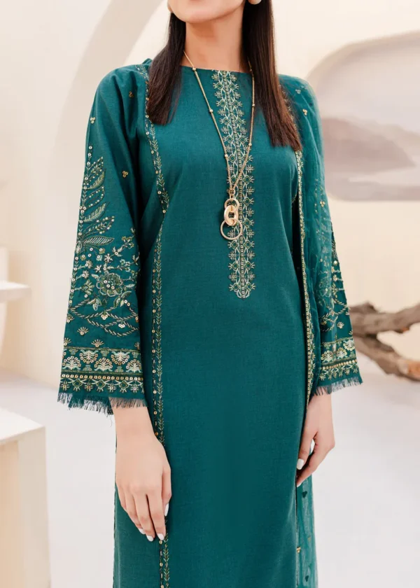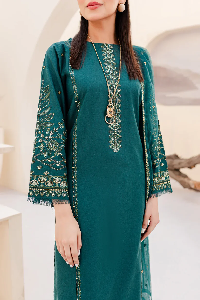 This elegant outfit is made from season’s favorite fabric COTTON in the shades of phthalo. Artfully paneled shirt features fine embroidery at neckline, shirt hem, and along the panels. Sleeves are embellished with heavy embroidery finished with fringe detail at hem.