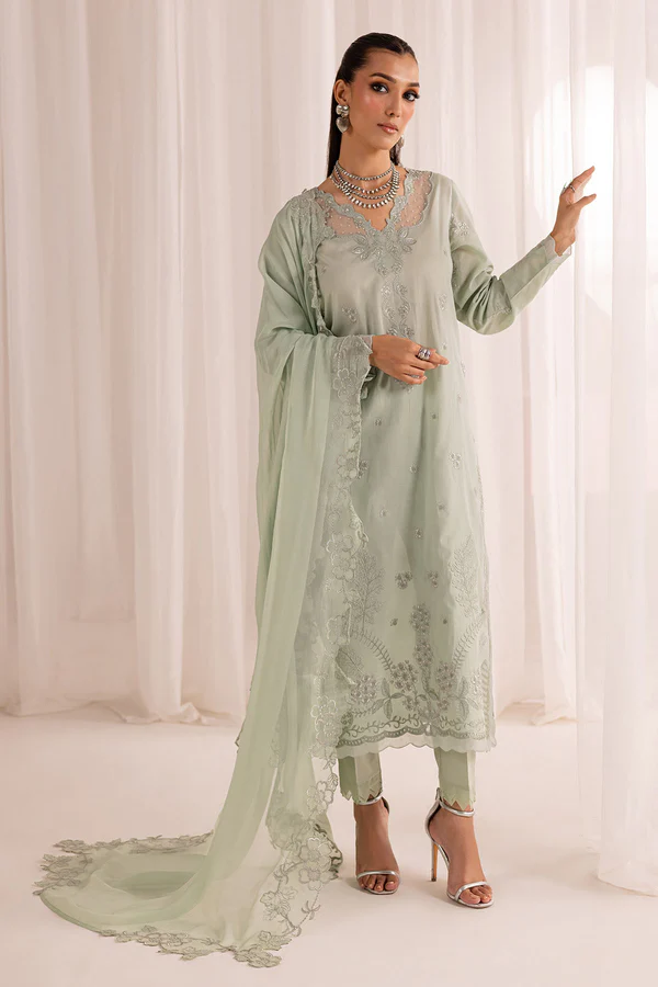 - Embroidered And Embellished Lawn Shirt Paired With Embroidered Chiffon Dupatta And Dyed Cotton Trouser