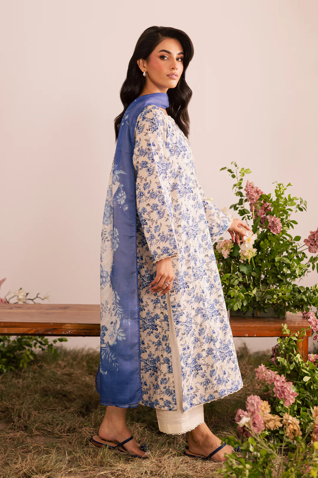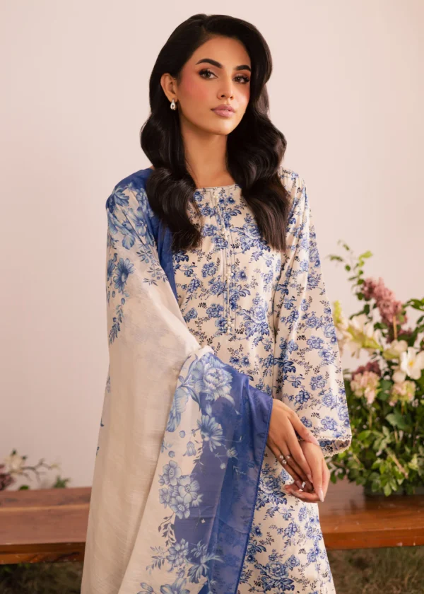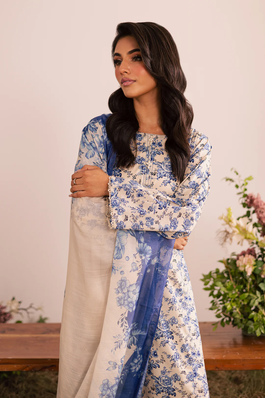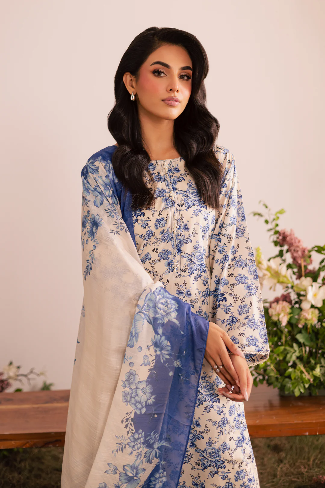 The ensemble is completed with a printed cotton silk dupatta, adding a soft, luxurious flair to the overall look.