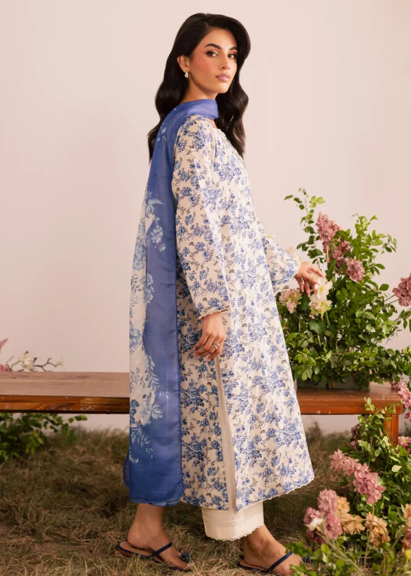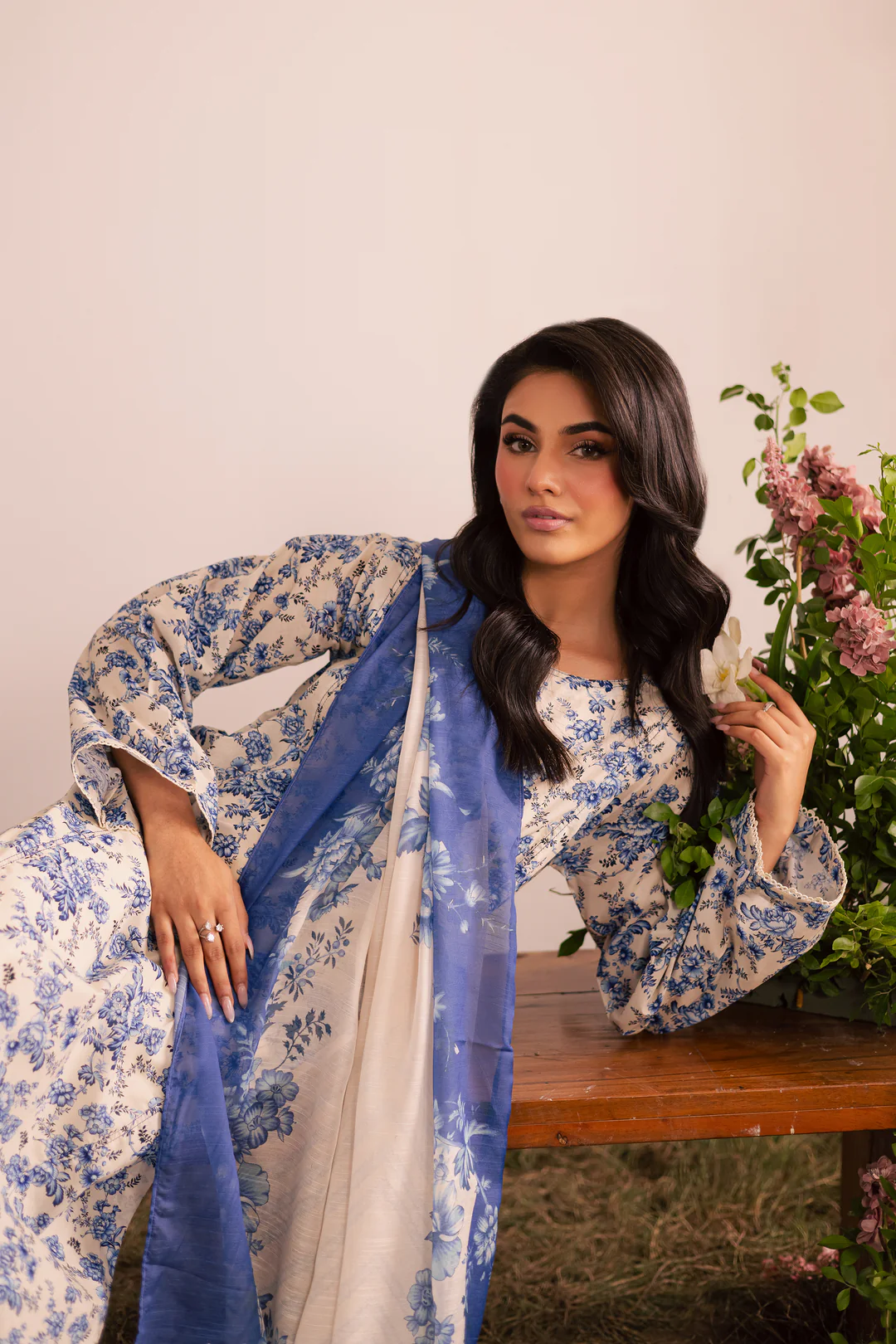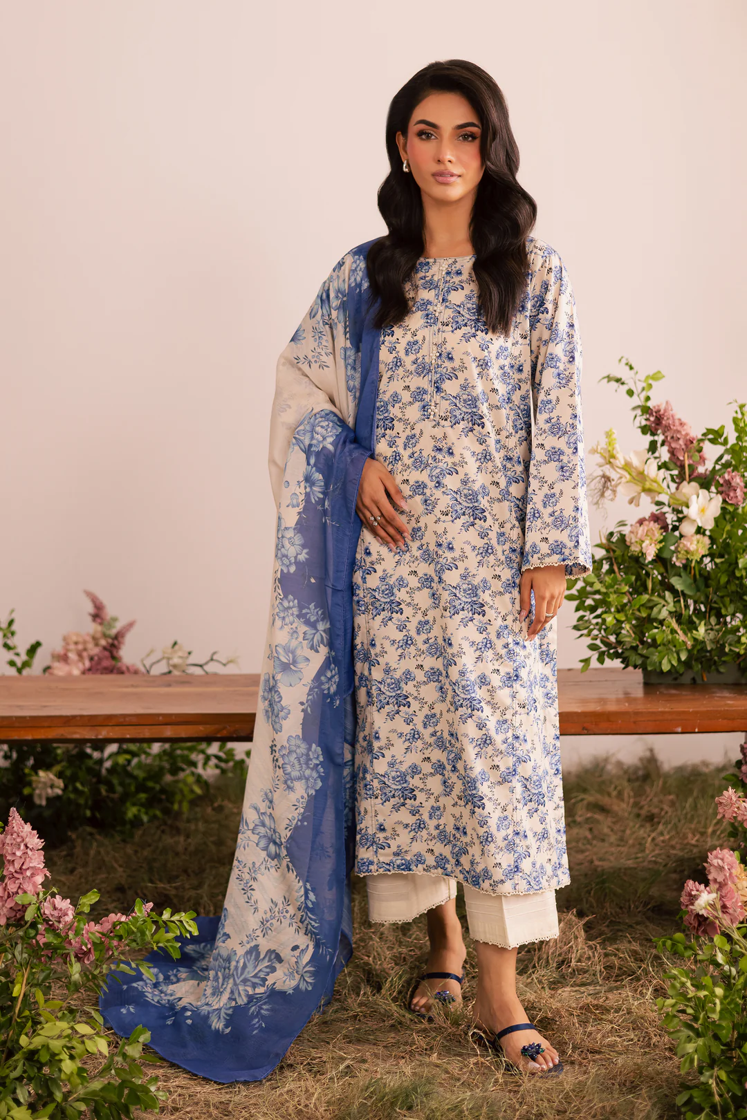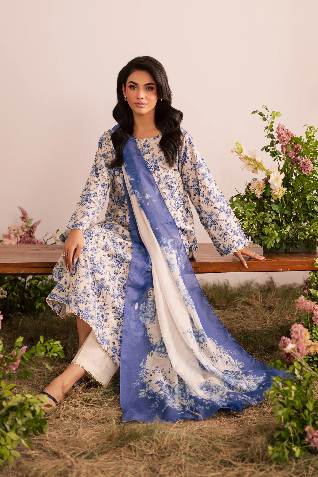The ensemble is completed with a printed cotton silk dupatta, adding a soft, luxurious flair to the overall look.