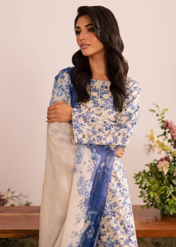 The paneled off-white pima lawn shirt features a graceful boat neckline, adorned with delicate pearl embellishments that add a subtle touch of elegance. The hem and sleeves are beautifully finished with lace, enhancing the shirt’s refined and feminine look.