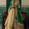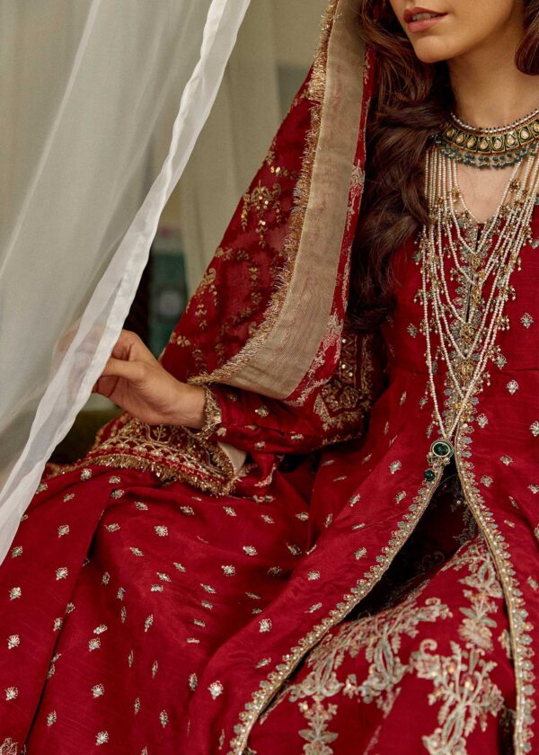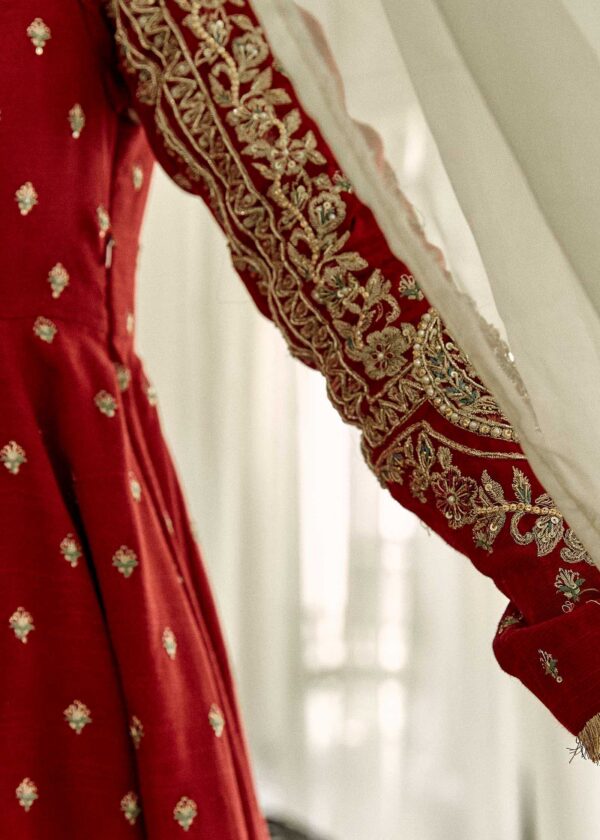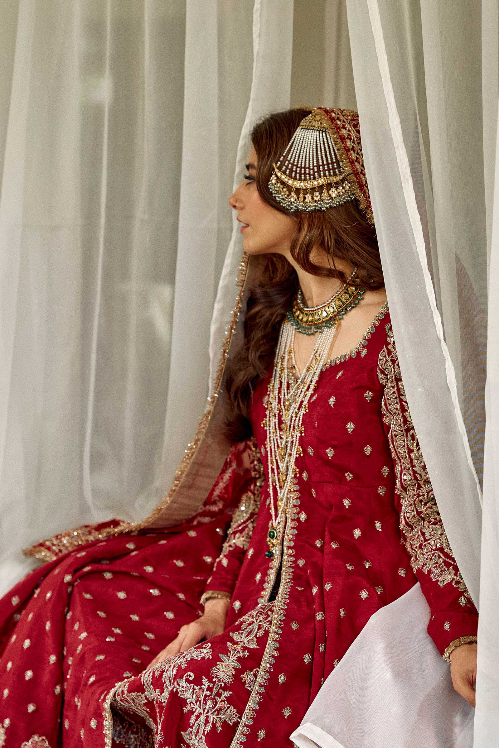 A beautiful fully embellished red peshwaz with hazaar booti embroidery all over, it has a heavily embellished border at the hem and champa on neck and it’s front opening. It is paired with a fully embroidered lehnga in red and complemented with a same hued dupatta with a heavily embroidered jaal and hand embellishments all over.